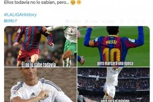 西甲官方晒出梅西的对比照,同时配文:“他还不知道,但他会在巴萨创造历史”,而对于C罗的对比照,西甲官方配文:“他还不知道,但他会成为皇马历史最佳射手”。